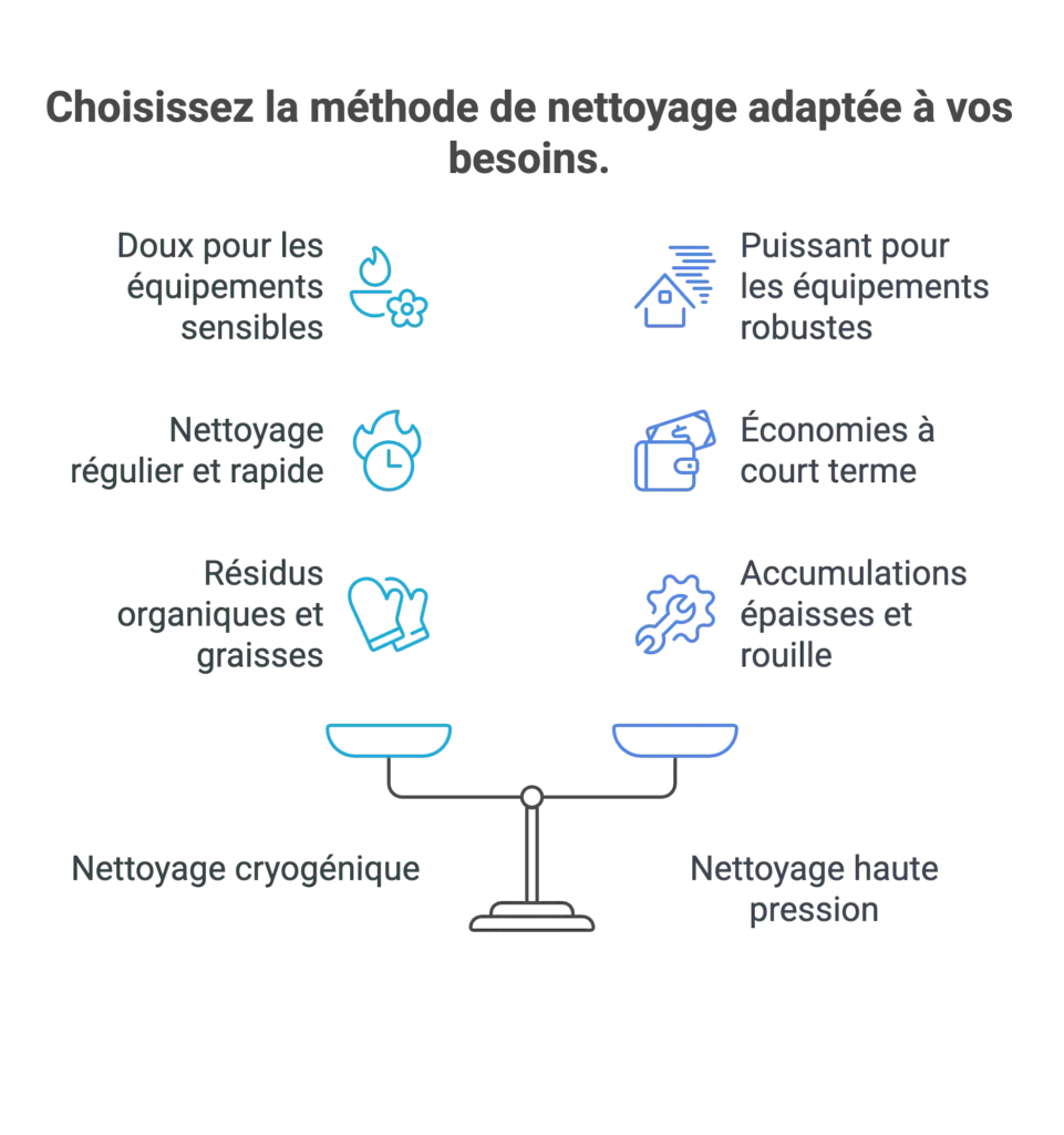 Le choix entre le nettoyage cryogénique et le nettoyage haute pression dépend de plusieurs critères essentiels :