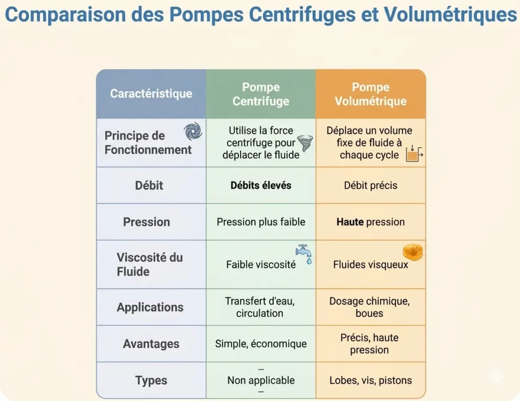 Le choix du type de pompe dépend de la nature du fluide, du débit souhaité et de la pression nécessaire, conformément au cahier des charges industriel.
